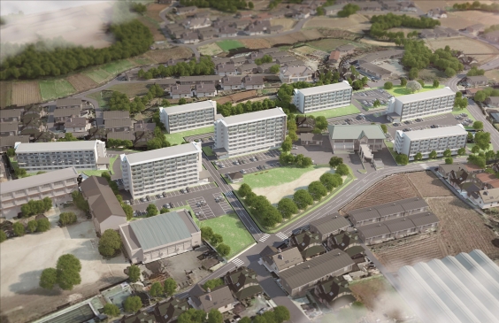 長洲町宮野地区地域優良賃貸住宅は、およそ33,000㎡の敷地内に5階建て5棟、8階建て2棟(全250戸)の建物のほか、駐車場、広場、管理センターなどを整備することとしています。