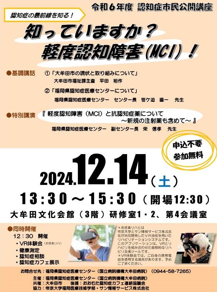 軽度認知障害(MCI)や新しいお薬についての市民公開講座を開催します。誰もが認知症になる可能性があります。この機会にお話を聞いてみませんか。