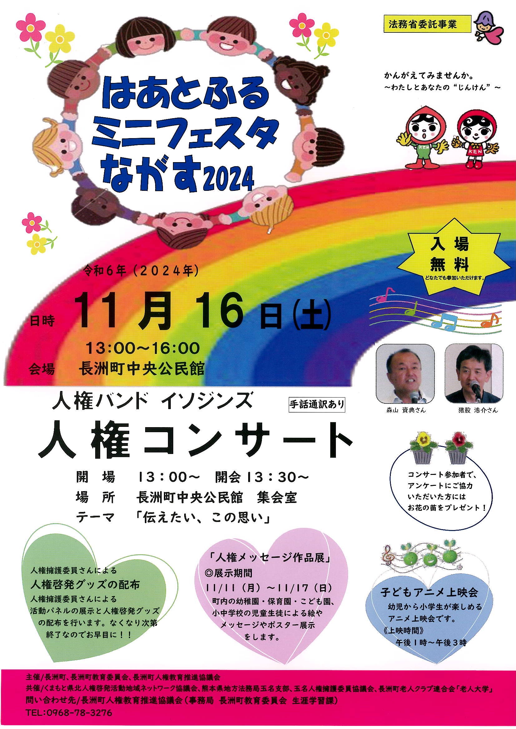 今年は、人権バンドイソジンズによるトークと歌のコンサートを開催します。人権をテーマに心に響く歌を届けます♪入場無料でどなたでも参加できます。(手話通訳あり)来場者にはお花の苗のプレゼントがあります。同時開催として「人権メッセージ作品展」「子どもアニメ上映会」があります。みなさんのお越しをお待ちしています。
